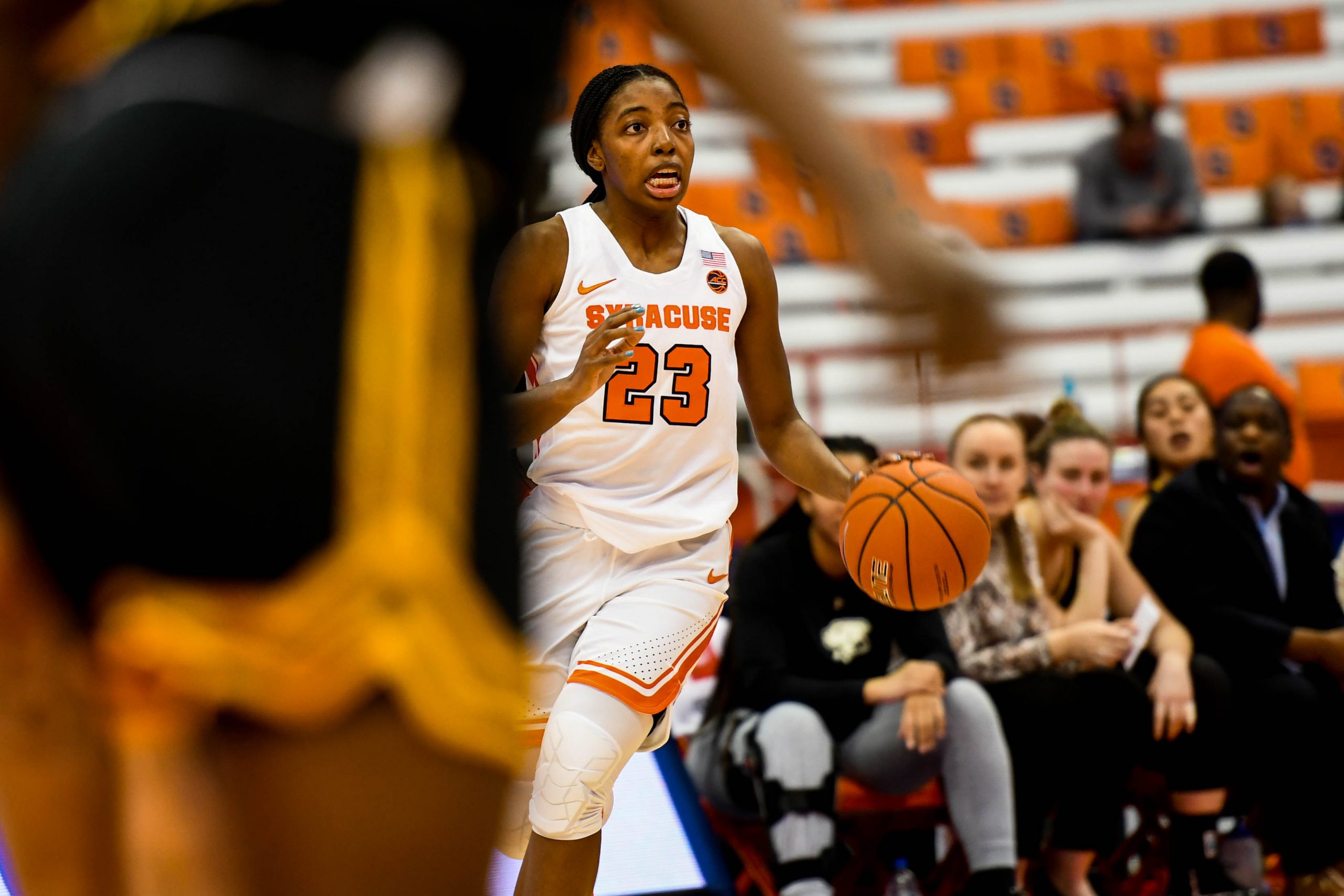 A successful press coincided with turnovers from Syracuse’s starting lineup, keeping UMBC close throughout the first half. After the first quarter break, which SU led 17-15, Taleah Washington pounced on a bounce pass to Retrievers forward Janee’a Summers feet from the baseline. After a scramble, the ball found Emily Engstler’s hands.